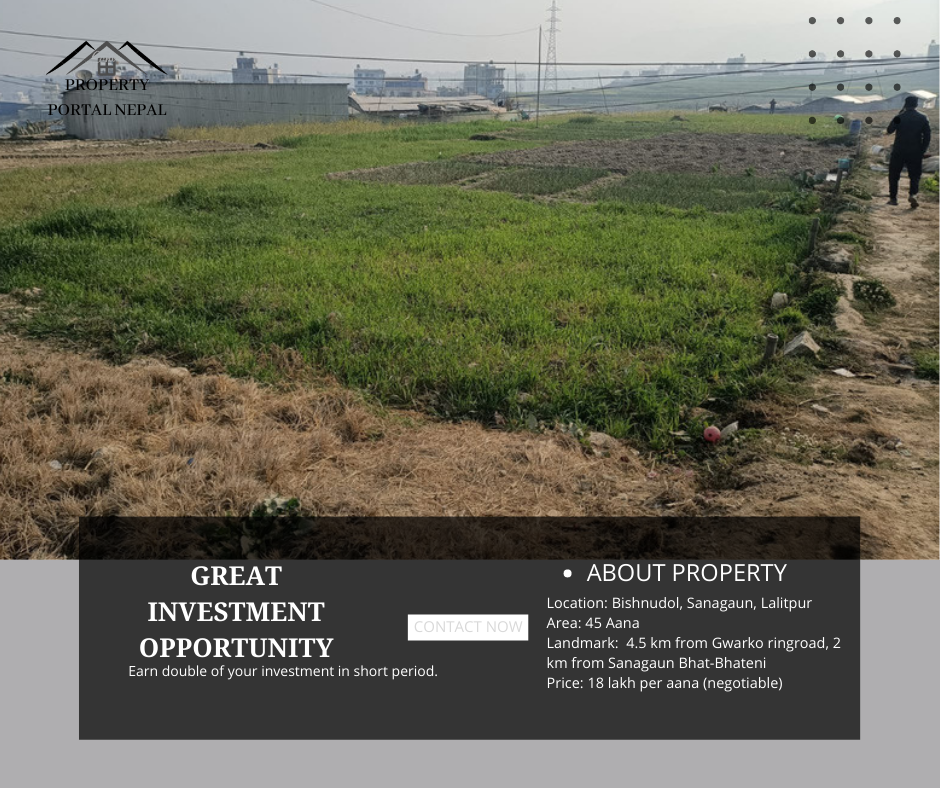 ललितपुर नगरपालिका - ८ हाल बिकास र आधुनिक बस्तीले रफतार लिई रहेको स्थान सानागाउँ, बिष्णुडोल मा लगानी उपयुक्त 44 आना आकर्षक मिलेको,26 फुटे main बाटो छोएको प्लतिङ्ग गर्दानी हुने, व्यवसायिक / आवासीय भवन निर्माण गर्दानी हुने जग्गा Property Portal Nepal द्वारा १ - २ वर्ष अगाडीनै चल्दै आएको मूल्य भन्दा सस्तोमा बिक्रीमा ल्याएको छ।